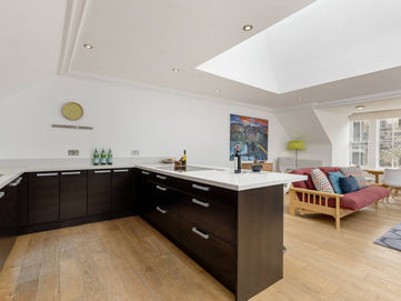 A bright and expansive kitchen / sitting room spans almost 30ft in length, providing a wonderful open-plan living and dining area, ideal for both everyday life and entertaining. The apartment’s layout is particularly appealing, with wide hallways and well-proportioned rooms that enhance the sense of space.