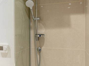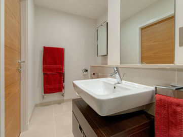 Modern Bathroom: Finished to a high standard, the bathroom features chic contemporary tiling, a large walk-in shower, and a heated towel rail.