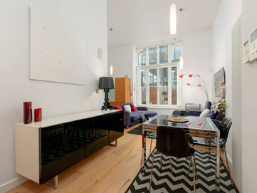 Bright Open-Plan Living/Kitchen Area: A stylish, spacious area with large sash windows, high ceilings, and premium finishes. The modern kitchen is fully fitted with integrated appliances and sleek cabinetry.