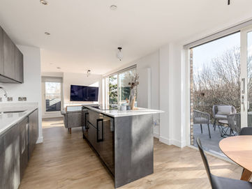 Designed with both style and functionality in mind, the property features a bright and spacious open-plan sitting, dining, and kitchen area with dual-aspect windows and direct access to two private balconies.