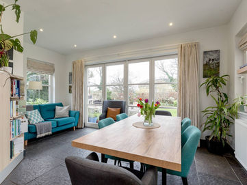 At the heart of the home lies a bright and spacious kitchen/dining room, flooded with natural light from roof windows and enhanced by bi-fold doors opening onto the garden. The kitchen is well-appointed with an excellent range of Kitchens International wall and base units, Corian worktops, and high-quality appliances including a range cooker, integrated oven and microwave, dishwasher, and American-style fridge/freezer. A charming fireplace with wood-burning stove adds further character.
